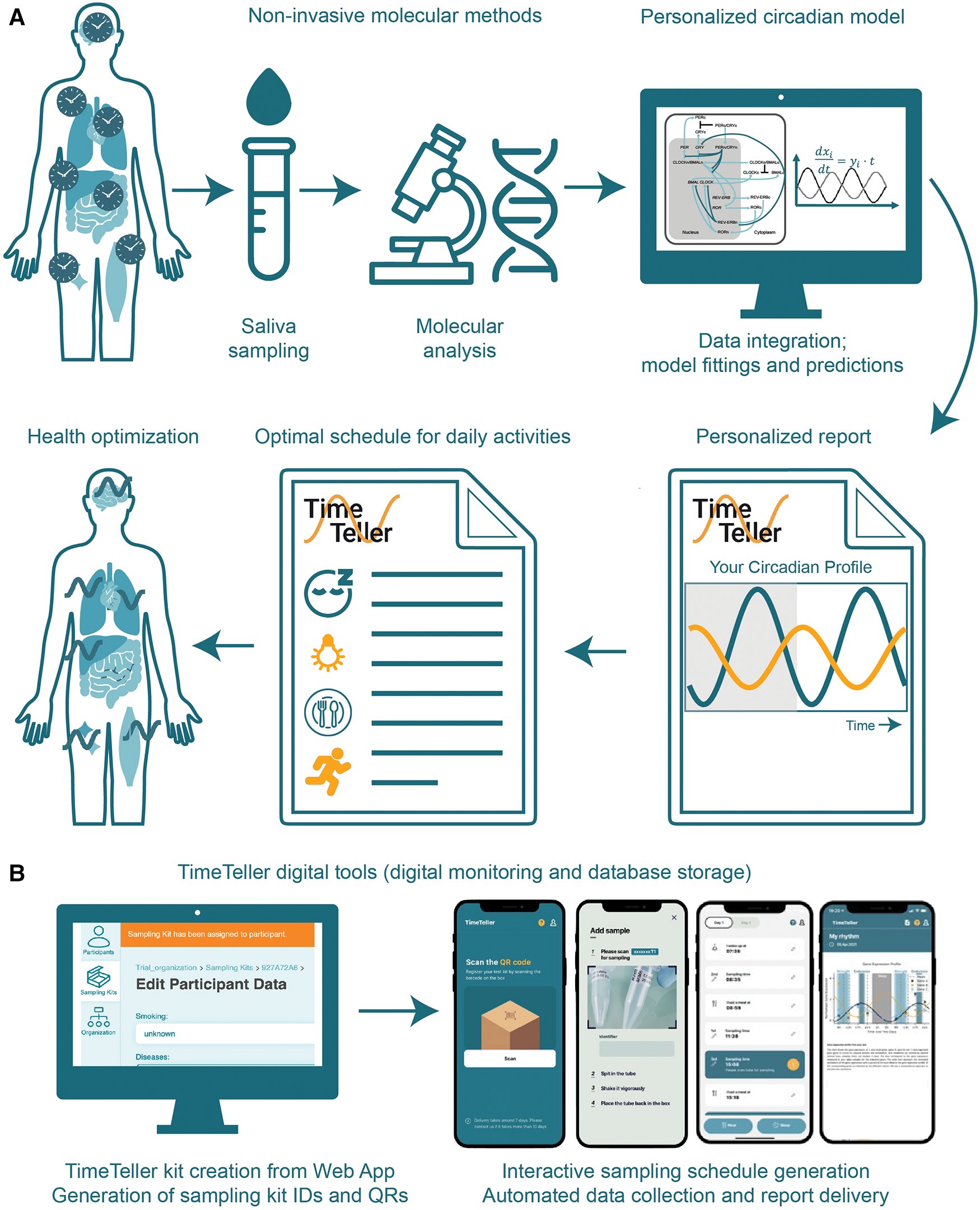TimeTeller: a non-invasive method for profiling the CR and prediction of optimal times for daily activities. (A) TimeTeller pipeline for saliva collection at defined times, molecular and computational analysis and report generation with circadian profile and recommendations to optimize health. (B) Digital tools to manage sampling logistics (left) and digital patient support to increase compliance (right).