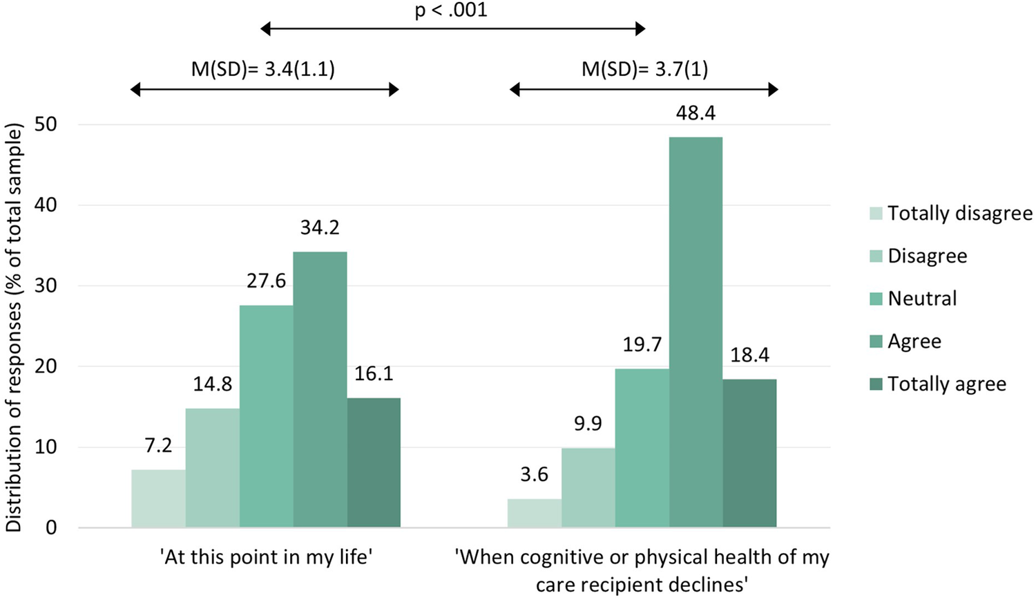 The final part of the survey assessed participants' general acceptance of CM technology, which was operationalized as follows: We measured intention to use CM technology by asking to what extent participants would agree to use CM technology in the care of their loved one with dementia for (a) “At this point in my life” and (b) “When cognitive or physical health of my care recipient declines”. Participants answered on a Likert scale from 1 (totally disagree) to 5 (totally agree).