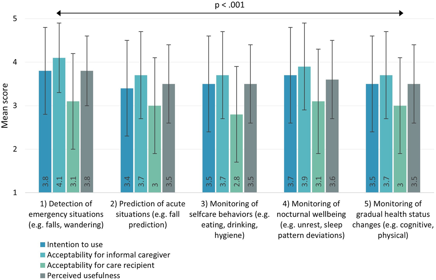 Shapiro-Wilk tests were conducted on all continuous variables to test for normality. Since data were not normally distributed, nonparametric tests were used. To test for significant differences in general acceptance of CM technology between “At this point in my life” and “When cognitive or physical health of my care recipient declines”, a Wilcoxon test was performed. To test for significant differences in acceptance between sensor types, a Friedman test and post-hoc pairwise comparisons with Bonferroni correction were executed. In the same way, significant differences in acceptance (intention to use, acceptability, perceived usefulness) between use scenarios were tested.