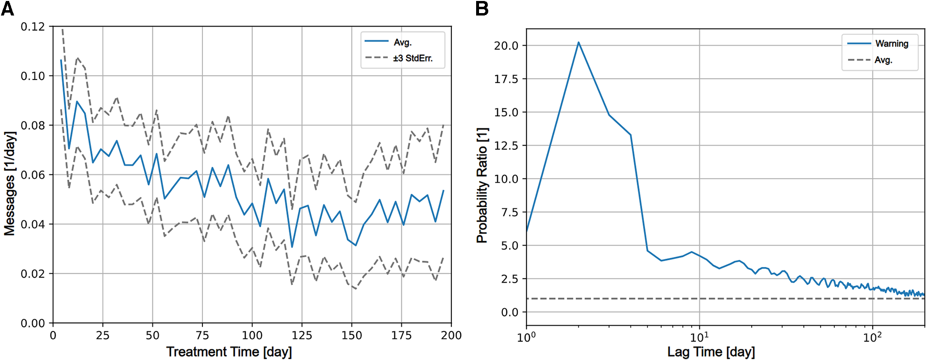 (A) Caregiver interactions through the eHealth tool (messages sent per day) decays over treatment time from an initial about 0.1 message sent per patient day to about 0.04 messages per patient day after 200 days in treatment. (B) The relative temporal patterns of coinciding events during treatment using cross-correlation are shown. Relative probability of messages sent to the patient (y-axis) at a lag of time (x-axis) after activation of the predictor (at day 0) is shown as blue solid line. The average probability for (any) message per patient day for the period was used for normalization is shown as dashed grey line. Days 1–3 after activation of the predictor, it is 10 times more probable that a message is sent, followed by a decline of messaging probability towards the average level.