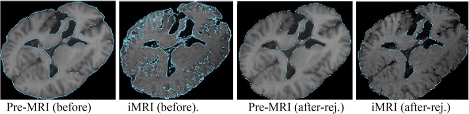 Figure 5. Point outlier rejection. Two left-most pre-op and iMRI depict (in blue) all edges detected before rejecting outliers, while the right-most figures depict the remaining edge points after outlier rejection.