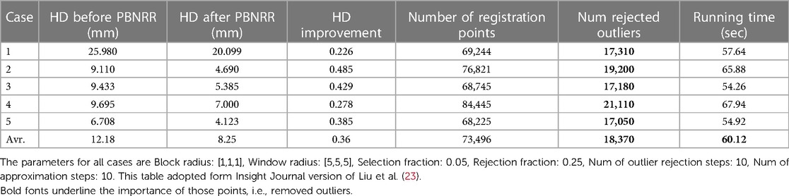 Table 2 indicates that out of about 73 K registration points, the PBNRR rejects about 18 K as outliers. A detailed study of 30 cases by Drakopoulos et al. (24) indicates this leads to a moderate (about 1.5 mm) improvement over the accuracy of the rigid registration and not a clear advantage over the B-Splines approximation scheme implemented in ITK and Slicer3D when accuracy is measured in terms of HD. A recent evaluation (24) from expert neurosurgeons (using specific brain landmarks) indicates that the accuracy of the PBNRR rejection scheme improves the max (and mean) average accuracy to 6.8 (and 3.4) mm from to 8.9 (and 5.6) mm 8.3 (and 4.4) mm by Rigid Registration1 and B-Splines2, respectively. Overall, the PBNRR3 outlier rejection scheme improves the registration accuracy between 1 mm and 2 mm from two state-of-the-art rigid registration schemes.
