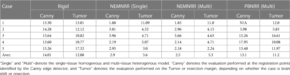 Using HD, the data in Table 5 suggest that NEMNRR and PBNRR do not perform well in the first case, a Partial Resection (PR). In the second case and around the tumor, it appears to be an improvement to about 1 mm. The remaining cases appear to have improved substantially. However, the evaluation results on edges and resection margins must be more consistent within the 1 mm tolerance. This is an area that needs to be studied further. Table 5 indicates that the NEMNRR multi-tissue (Single) reduces the error of Rigid Registration at the registration points from 14.10 mm to 2.5 (2.9) mm, but the evaluation on the resection margin shows the error is reduced only from 12.08 mm to 5.3 (5.6) mm. The reason for this is most likely that the detected edges, although well-aligned, are too far away from the tumor and the resection region and, thus, ineffective in driving the model to estimate the deformation around the resection margin. A larger number of cases (25) were analyzed and compared with both NEMNRR and PBNRR (13), indicating that the mean plus/minus standard deviation for HD between the pre-MRI and iMRI for RR, PBNRR, and NEMNRR is 17.48+/−0.2, 12.7+/−5.4, and 9.8+/−4.7, respectively.
