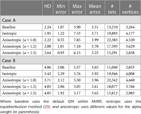 Over the last 15 years, we developed three different Image-to-Mesh (I2M) conversion methods for medical applications: (i) Body-Centered Cubic (BCC) was proposed by Molino et al. (33) and was implemented by Fedorov et al. (34) for a single-tissue and it was initially used in PBNRR (8). Then, a multi-tissue capability was used by Liu et al. (19, 20), and it was used in NEMNRR (13) and mesh gradation (i.e., control mesh size to reduce without compromising the fidelity of the mesh) by Drakopoulos et al. (35); (ii) Delaunay-based (27), and it is used in real-time ANRR with the results presented in Drakopoulos et al. (14, 24) and in Table 7; (iii) Lattice Decimation methods (36) because the relatively dense initial BCC mesh captures the object surface without much compression, thus preserving the good angles of the BCC triangulation. All three methods developed and evaluated for this project need further development regarding topologic accuracy in the presence of multi-tissue models. For example, one important question is: “How many materials can be accurately reconstructed around a mesh vertex or an edge so that the multi-tissue mesh is a topologically accurate representation of the input data?”