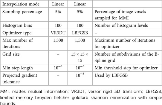 Table 8 presents data from two cases: (A: case 9 from Drakopoulos et al. (24), provided by HSH (male, with glioma at Left Frontal location of the brain, where Partial Resection is performed, with preop-MRI and iMRI image sizes and spacing: 448 × 512 × 176 and 0.488 × 0.488 × 1.00, respectively) and (B: case 18 from Drakopoulos et al. (24), provided by HSH (female, with glioma at Left Frontal location of the brain, where Total Resection is performed, with preop-MRI and iMRI image sizes and spacing: 448 × 512 × 176 and 0.488 × 0.488 × 1.00, respectively).