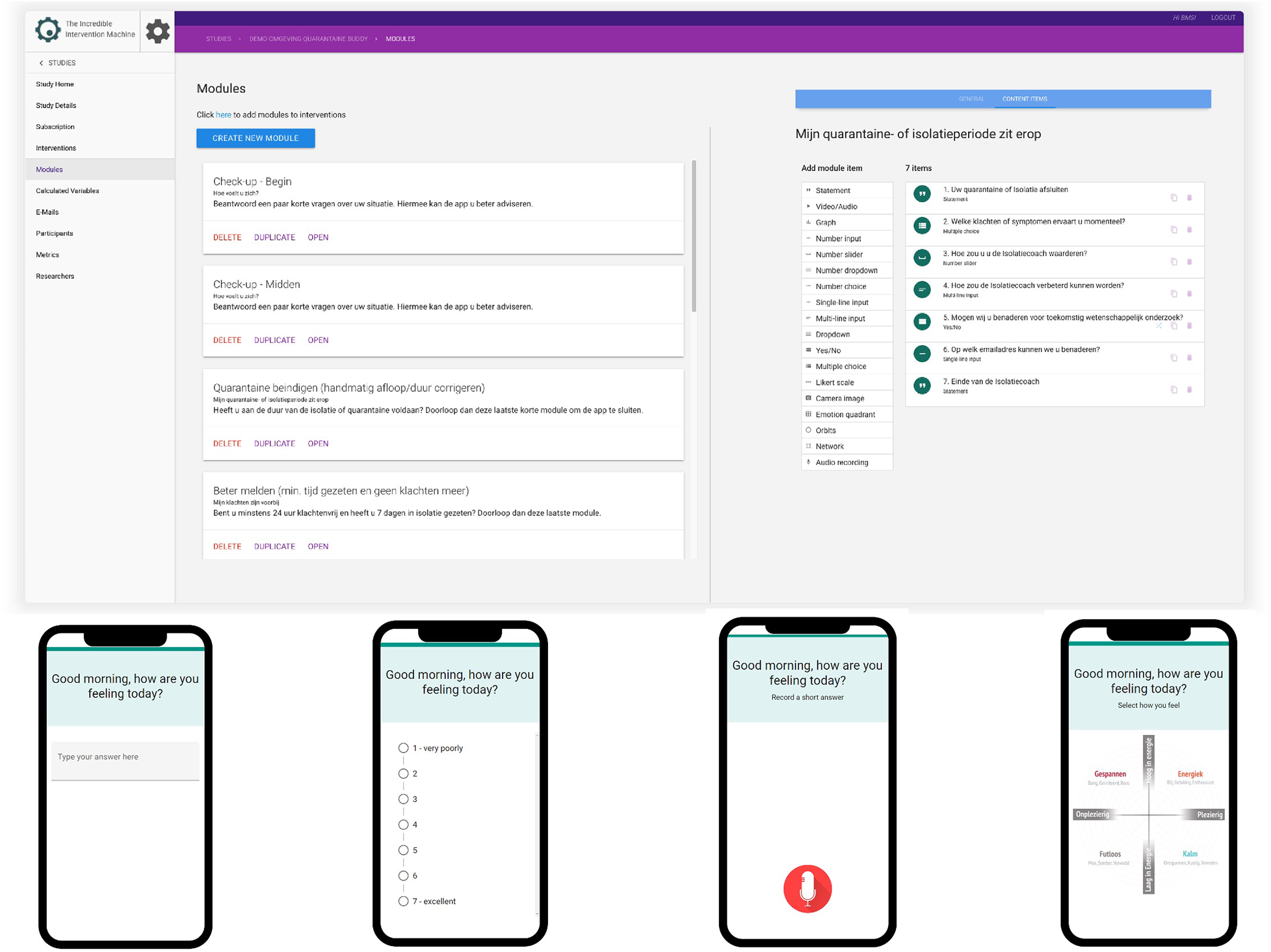 Administration portal (researcher/professional side, top) and front end (participant/patient side, bottom) of TIIM.