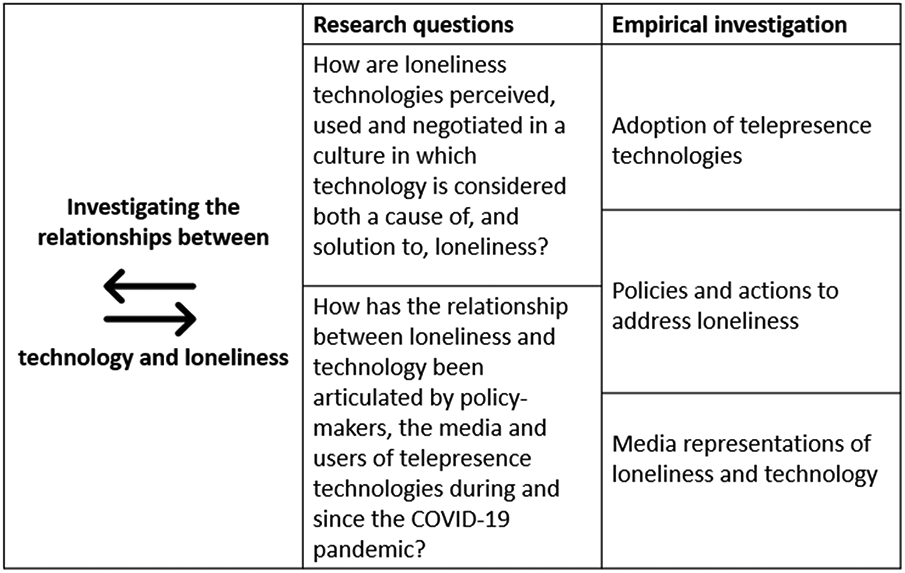Our methodological approach was intended to “unpack” the cultural dialectic between loneliness and technology, and in particular to ask the research questions: How are loneliness technologies perceived, used and negotiated in a culture in which technology is considered both a cause of, and solution to, loneliness? How has the relationship between loneliness and technology been articulated by policy-makers, the media and users of telepresence technologies during and since the COVID-19 pandemic? We provide a diagrammatic overview of our study design in Figure 1.