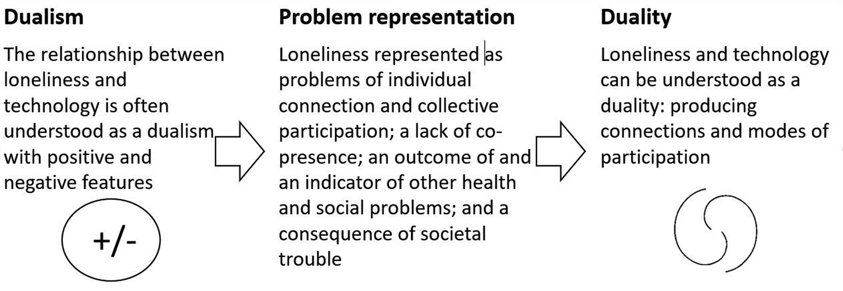 The relationship between technology and loneliness is frequently represented as a dualism: the relationship has positive and negative characteristics with technology understood as having the power to both cause and cure loneliness and social isolation. Nowland et al.'s psychologically informed work captured this dualism in their representation of the relationship between social internet use and loneliness as bidirectional and dynamic; when used for social connections the internet can enhance relationships but when used to withdraw from social interaction it can exacerbate loneliness (12). The dualism of the relationship between technology and loneliness has also emerged from studies in diverse fields including medicine, public health, health services research, media and communications. Broader sociological and historical studies of loneliness provide further perspectives on this dynamic. We outline these varied perspectives before offering an approach to understanding the relationship between loneliness and technology which moves from dualism (recognising the separate but paired elements of the relationship) to duality: recognising the interdependence and mutually constitutive nature of the relationship (13, 14).