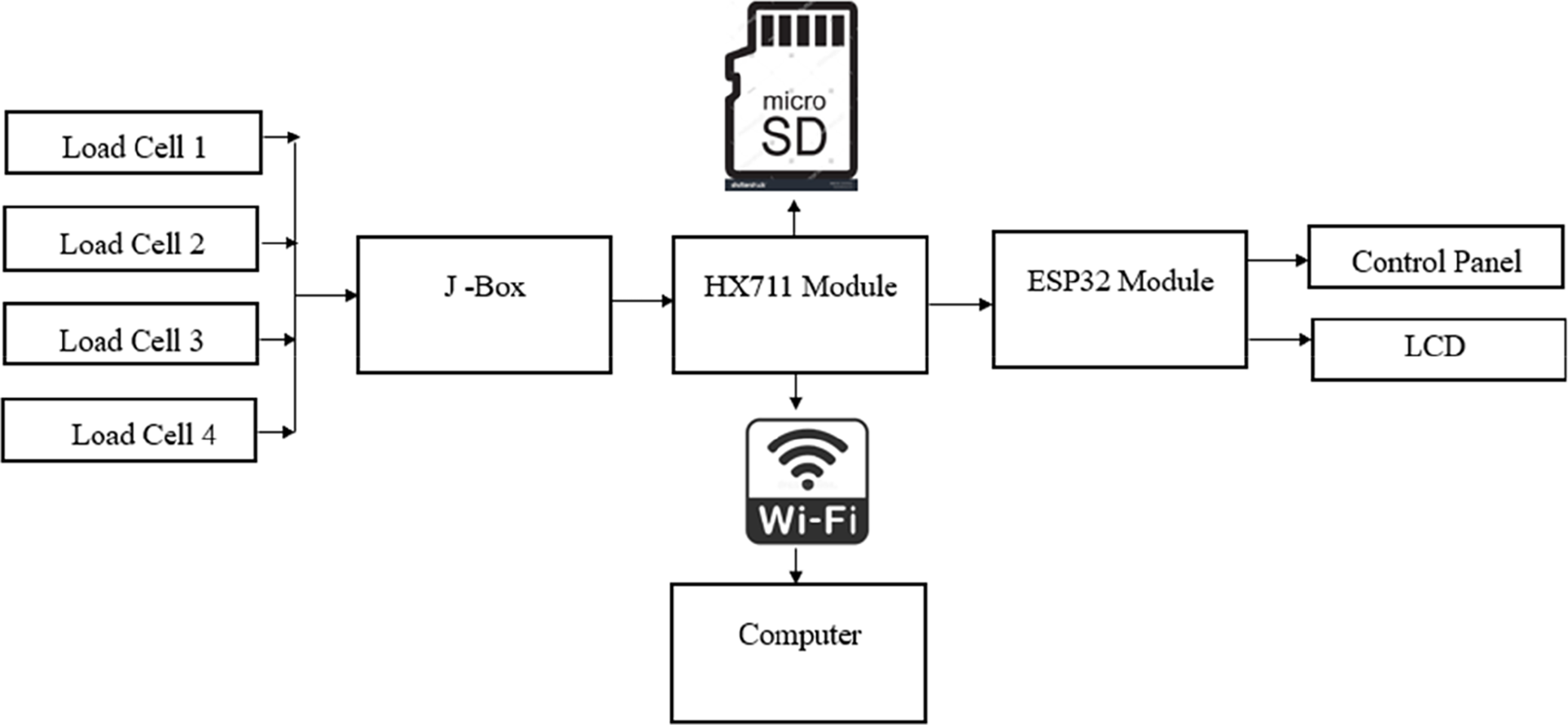 This research aims to provide a method of weighing the patient in lying condition. The hardware control flow is shown in Figure 1. To achieve this, four strain gauge load cells are mounted beneath the upper part of the trolley where a patient will be placed. These load cells work on the principle of the Wheatstone Bridge. They produce a slight change in the output voltage when weight is applied to it. Since there are four load cells, there will be four different output voltages from each load cell. The need for four cells is to mount the cells on four corners of the trolley frame. This ensures the uniform weight distribution on the load cells to capture accurate weight. To maintain the stability of capturing the weight, the load cells are placed on four corners to avoid the influence of uneven movements while lying in the trauma position. A junction box signals the condition of these load cell outputs and has a single measurable output for the measuring device (i.e., Microcontroller). A junction box is an electronic circuit which sums and averages the multiple input coming from the load cells and provides a single output for the measuring device. The load cell output will be in the range of “mV”. It is difficult for the measuring instrument to detect this small voltage. The input should be amplified before it is passed to the measuring device. To amplify the input signal, the HX711 module is used. It has an amplification gain of 128 and a 24-bit precision ADC. The measuring device is ESP32, a ULP Microcontroller that comes with Bluetooth and Wi-Fi and can run on a clock speed of 240 MHz. The signal conditioning circuit comes with tare, reset, and save buttons for taking the weight and saving the current data to the database and arrow buttons (up and down) to move between the screens. A 16 × 2 LCD is used to display the weight measured and time of admission. The patient's weight will be displayed as soon as the patient is placed on the trolley. To avoid data loss, an external SD card is used to store data frequently for every 30 s, which can be accessed at any point in time. Data logging through Wi-Fi makes this invention feasible, which will help medical personnel access patient data from anywhere in the hospital. The electronic circuit and the load cells are powered by a battery, which can be recharged from the main power supply when the stretcher is free. A battery management system (BMS) is designed to provide a constant 5 V supply to the circuitry and charging circuit for the battery. The complete electronic circuits including the battery, were placed in the compartment under the stretcher.