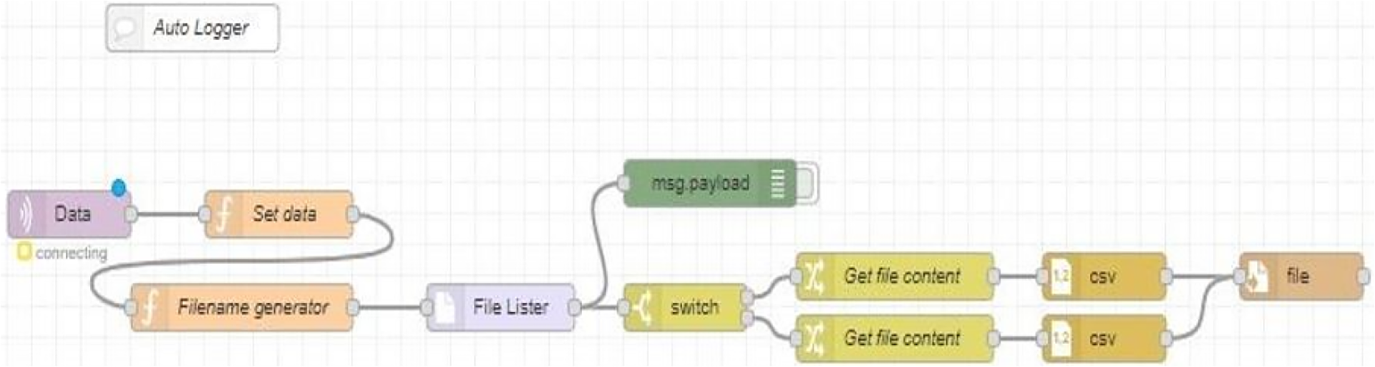 Node-RED is a cloud-based programming tool designed by IBM to bring together hardware devices, APIs, and online services as a part of the Internet of Things. It uses a browser-based flow editing tool to wire together the multiple nodes in the node palette, where all the nodes can be deployed together in a single click. It provides a visual observation for the user by designing a proper dashboard UI. As per the requirement, NODE-RED flow is designed such that a CSV file is generated every day, and it receives the data i.e., the weight and timestamp, and saves the data in the CSV file every 30 s for the whole day (Figure 5). A dashboard UI is created to monitor the saved data visually from a remote location. The data is transferred over the Wi-Fi using the MQTT protocol; node-red comes with built-in MQTT APIs making it more feasible for data logging (Figure 6).