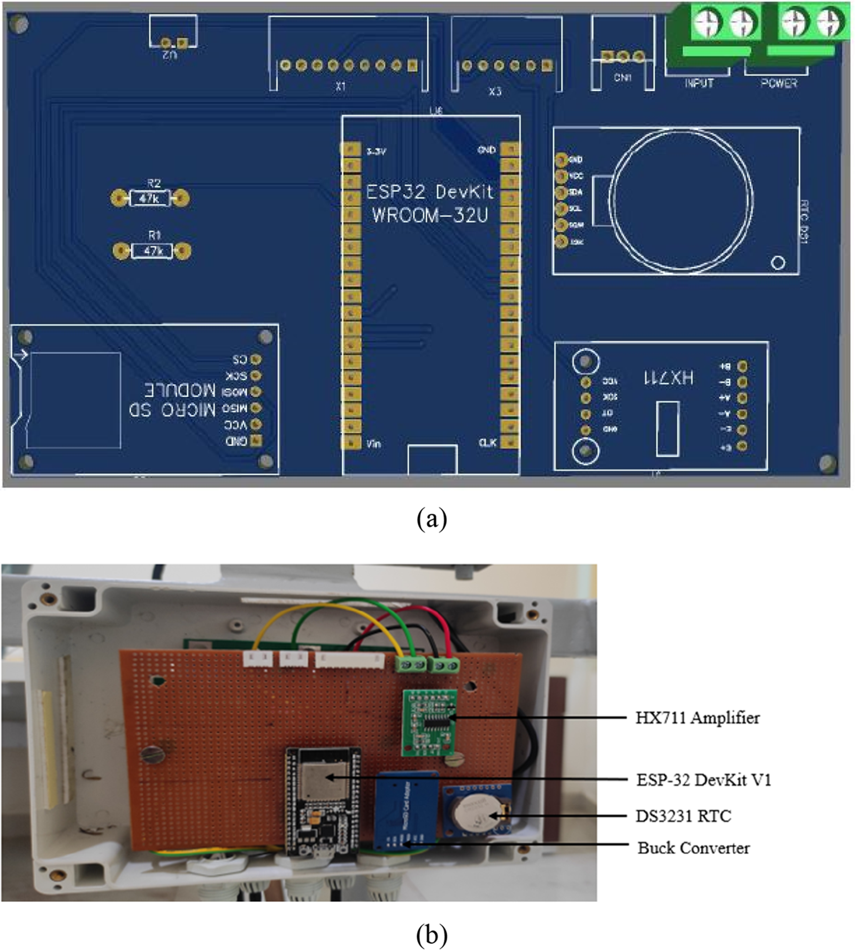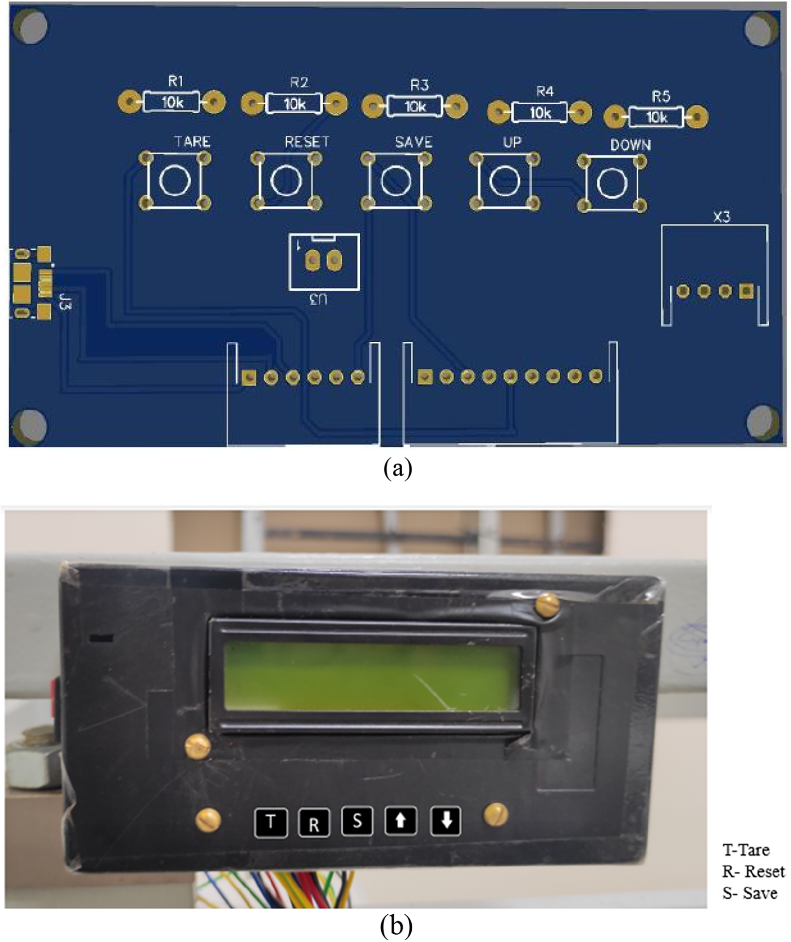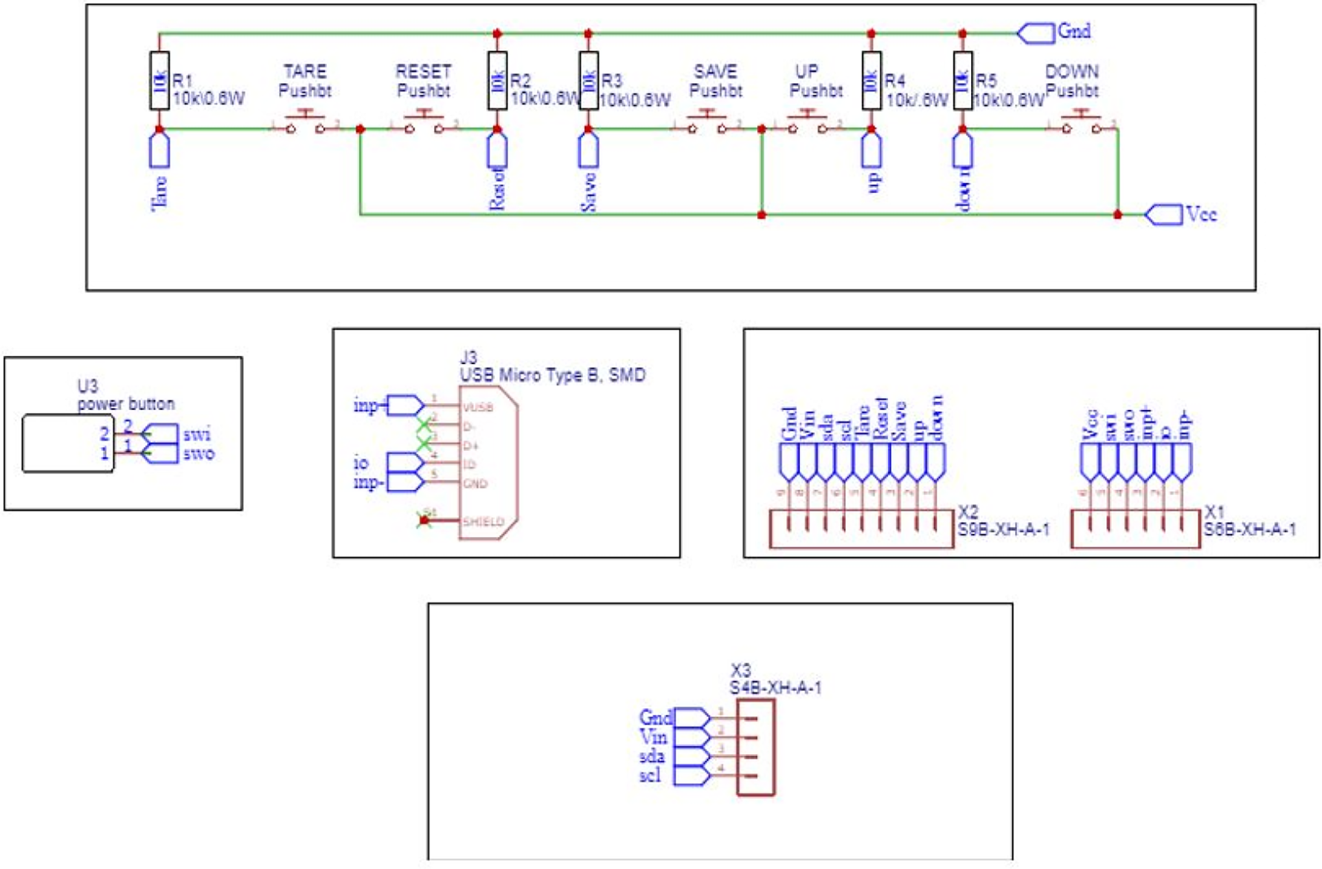 The schematic design includes the interface of different modules like load cell, SD card module, RTC module, LCD to the microcontroller, and transforming the design into a PCB. The schematic of the Main controller and Display panel is shown in Figures 7, 8. The Schematic and PCB are designed using EasyEDA software. EasyEDA is a cloud-based online EDA design tool that enables the ability to design and simulate schematic, simulation, and printed circuit boards. As per the requirement of the work, two PCBs are designed: (i) Main Controller and (ii) Display panel. The main controller PCB includes a Controller, RTC, and load cell amplifier (Figure 9), and the display panel consists of the SD card module, LCD, and Micro-USB type B charging port (Figure 10).