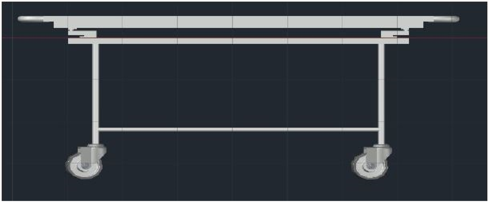 The 3D model of the structure is designed using a CAD Tool, or computer-aided design and drafting (CADD), a technology for design and technical documentation that replaces manual drafting with an automated process. The complete mechanical structure uses AUTO-CAD, and the case is designed using the FUSION360 3D design tool. Figures 11, 12 show the top and side view of a 3D model of a custom-design Trolley.