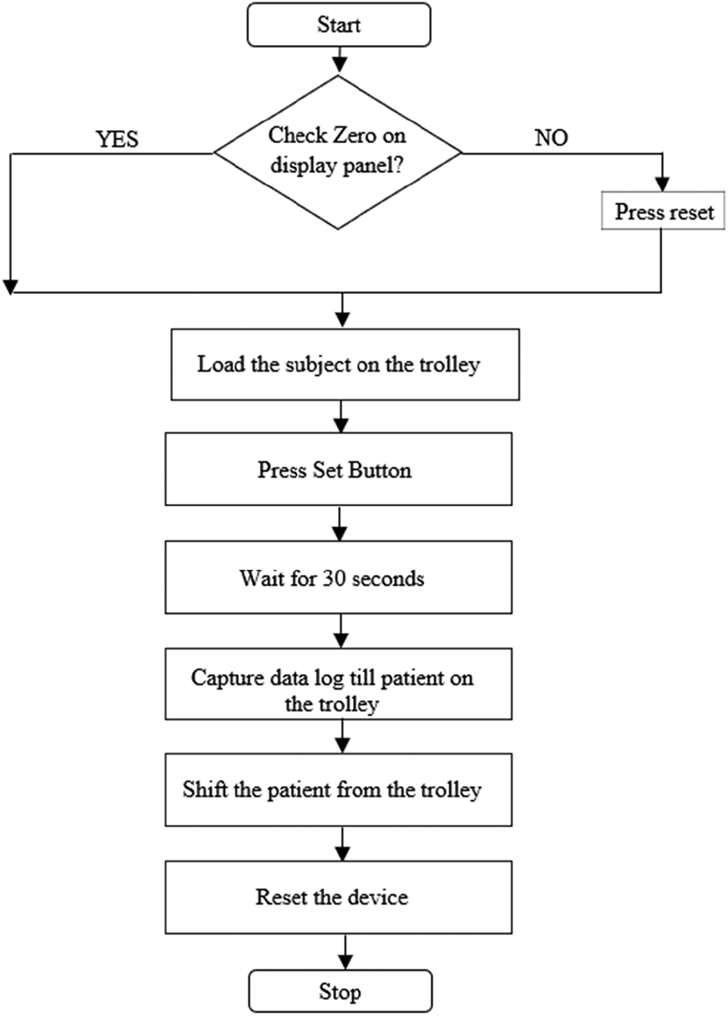 A special trolley has been designed with weight measuring sensors and display unit for this application. A microcontroller unit on the trolley performs data storage and display operations and will be connected to a nearby PC through wireless. Provisions have been made to auto data log for every 30 s on the remote PC. Communication has been tested for a range of 100 m. The display unit is designed with save, tare, reset buttons with complete battery backup and rechargeable option. The prototype has been tested with an accuracy of ±50 g with a full-scale range of 2–400 kg and the snapshots have been added here. A flow chart of the trolley usage is shown in Figure 13. Initially, the display panel made zero before placing the patient on the trolley. Load the subject on the trolley and press the set button. Wait for 30 s to get accurate weight reading and now, system continuously sends the weight information to the server. Once the measurement is completed, patient can be shifted from the trolley if required. Press reset button to halt the system.