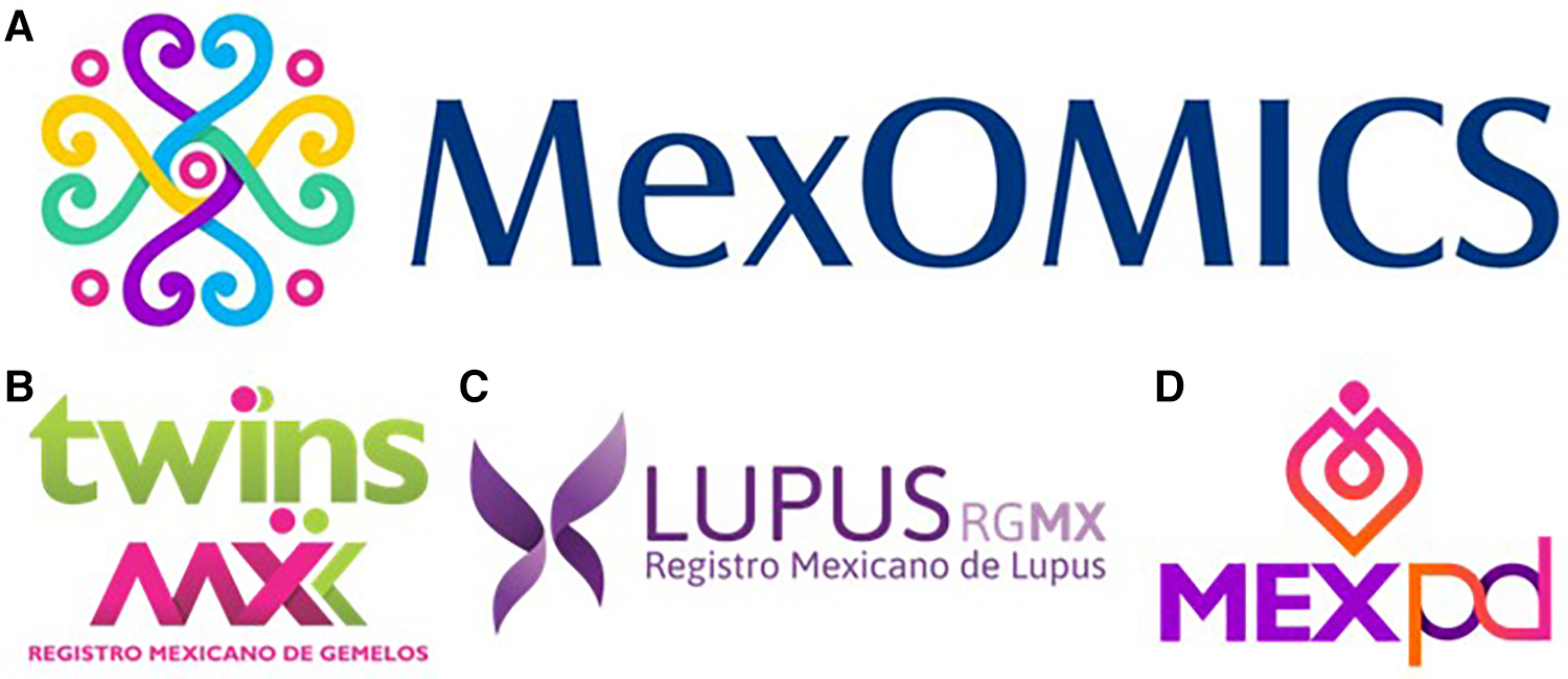 The logo of “MexOMICS” is accompanied by four entangled DNA strands, each representing the conjunction of projects (TwinsMX, LupusRGMX, and MEX-PD) in a Mexican-styled design that resembles a prehispanic symbol known as ollin, which represents “movement” (Figure 1A).