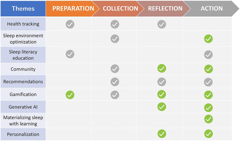 Figure 3. Mapping the themes surfaced in the brainwriting activity to the stage-based self-tracking model. Green check marks indicate new design ideas generated in the workshops, and grey check marks indicate ideas that overlap with existing features of sleep health technologies.
