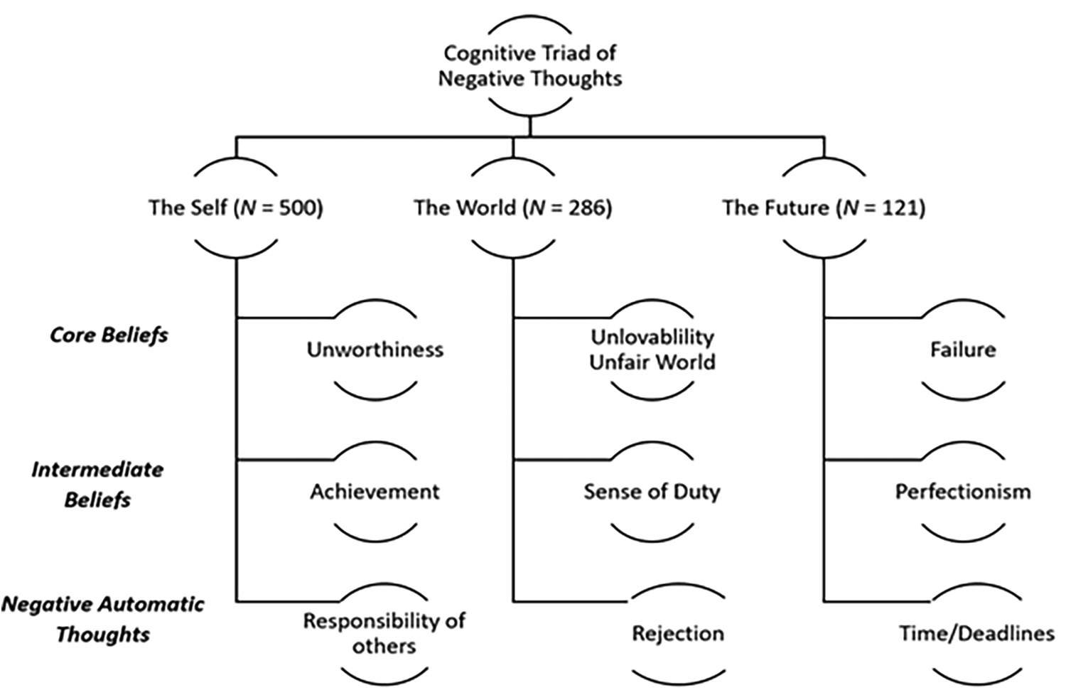 The negative affective states and thoughts of the users were examined from the extracted snippets using Beck's cognitive triad model, which segregated the snippets into the domains based on cognitive patterns related to the self, the world and the future (12). The snippets within the cognitive triad categories, were further split into the three levels of the hierarchical organization of thinking, namely core beliefs, intermediate beliefs and negative automatic thoughts (12).