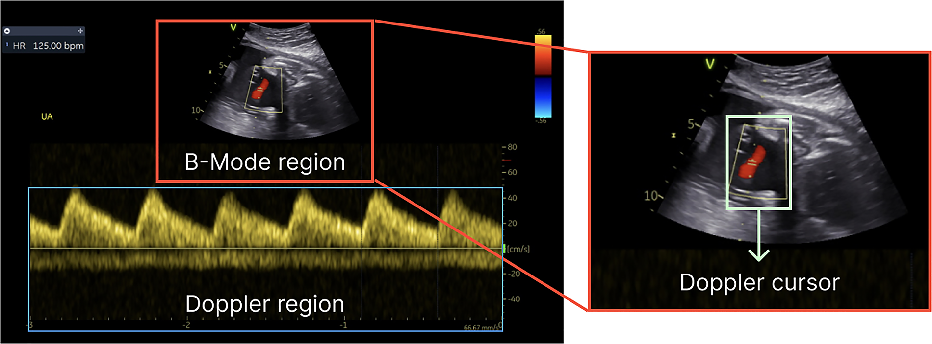 Components of a Doppler image—B-mode for structural details, the Doppler region for blood flow information and Doppler cursor on top of the B-mode region.