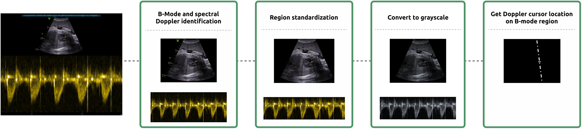 Schematization of the pre-processing steps. Pre-processing consisted of the identification of the B-Mode and spectral Doppler regions, region standardization with the removal of burnt-in annotation and cropping, grayscale conversion and the location of the Doppler cursor on top of the B-mode region.