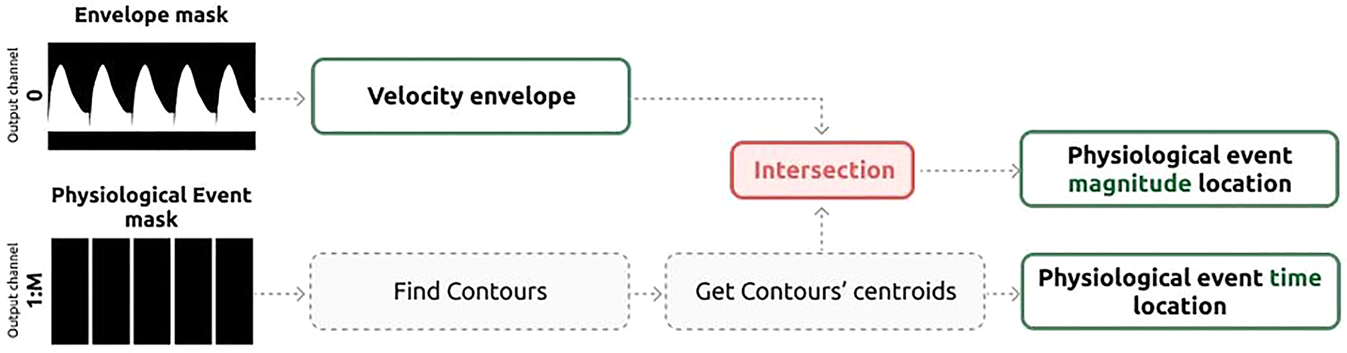 After acquiring the binary masks representing the velocity envelope and the time-coordinates of targeted physiological events, our methodology involved a sequence of post-processing procedures (represented in Figure 5). These steps aimed to precisely determine both the temporal position and magnitude of the desired events within the Doppler signal, such as ejection beginning or peak velocity.