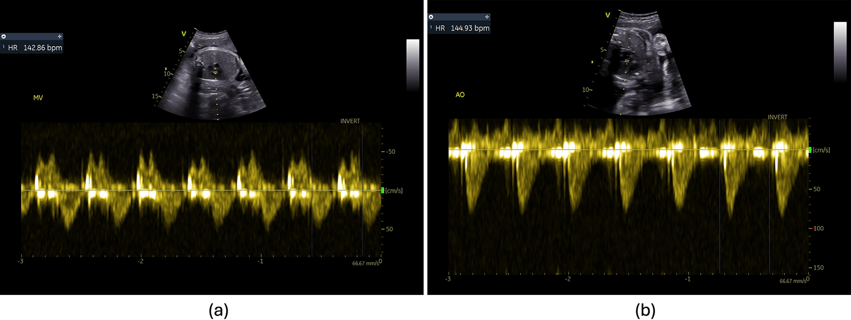 This study focuses on four different feto-placental Doppler sites (see Figure 2): the MCA, UA, AoI, and LVIO. The MCA, focusing on cerebral circulation, was segmented by marking onset S and the systolic peak (S peak) in each cardiac cycle. Similarly, the UA, highlighting feto-placental blood flow, was traced using the same physiological events. Notably, both the MCA and UA Doppler signals consistently appeared either completely above or below the Doppler zero line. For the AoI, the key markers were placed at onset S and S peak. AoI images could include possible reversal flow, leading to the presence of Doppler signals on both sides of the zero line. Lastly, the LVIO captures combined blood flow through the mitral and aortic valves, which have opposite directions. This view was acquired using a cross-sectional view of the fetal thorax, at the level of the four-chamber view of the heart, a 2–4 mm Doppler sample volume was placed to include both the lateral wall of the ascending aorta and the mitral valve. The ventricular outflow tracing relied on systole (S) onset, S, and end of S, while the mitral inflow was traced through the onset of early diastolic (E) wave, E peak, atrial (A) peak and end of A wave. Besides the physiologically relevant control points mentioned, users could add additional control points to improve the fitting of a spline curve for defining the envelope.