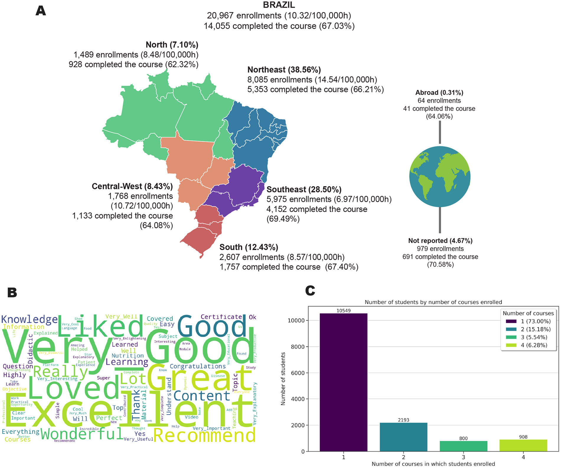 Summary of enrollment and student evaluation data. (A) Enrollment distribution across Brazil. (B) Word cloud based on students' comments. (C) Histogram showing the number of courses enrolled by students.