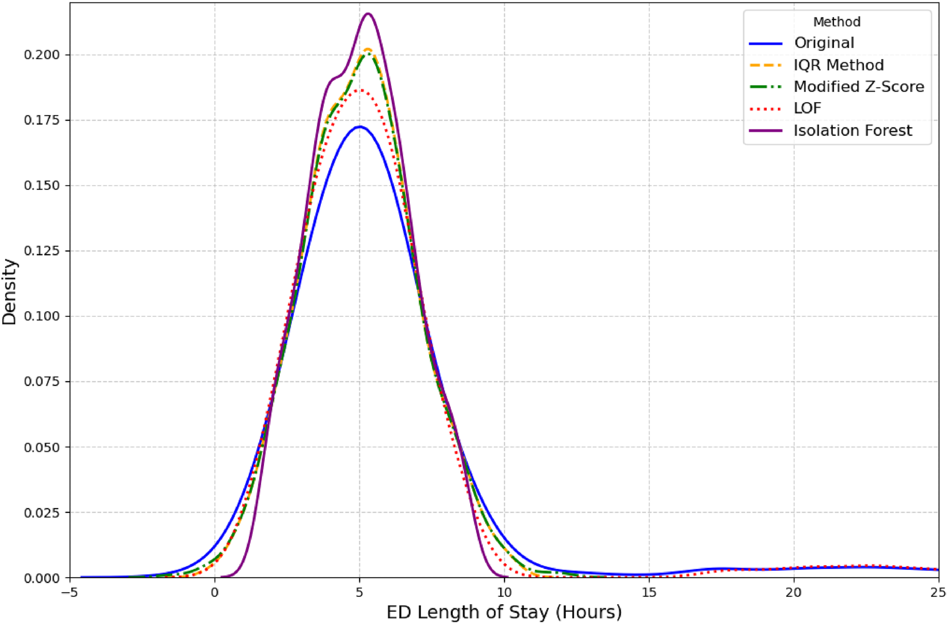 Second, outlier detection was performed on the outcome variable ED LOS. We used several established methods for this purpose, including the Interquartile Range (IQR), Modified Z-score, and unsupervised learning models like Isolation Forest and Local Outlier Factor (LOF) (27, 28). LOF outperformed other methods as it was able to retain a distribution closest to original distribution as seen in Figure 2. A complete overview of the total missing values for all variables discussed above can be found in Table 2.