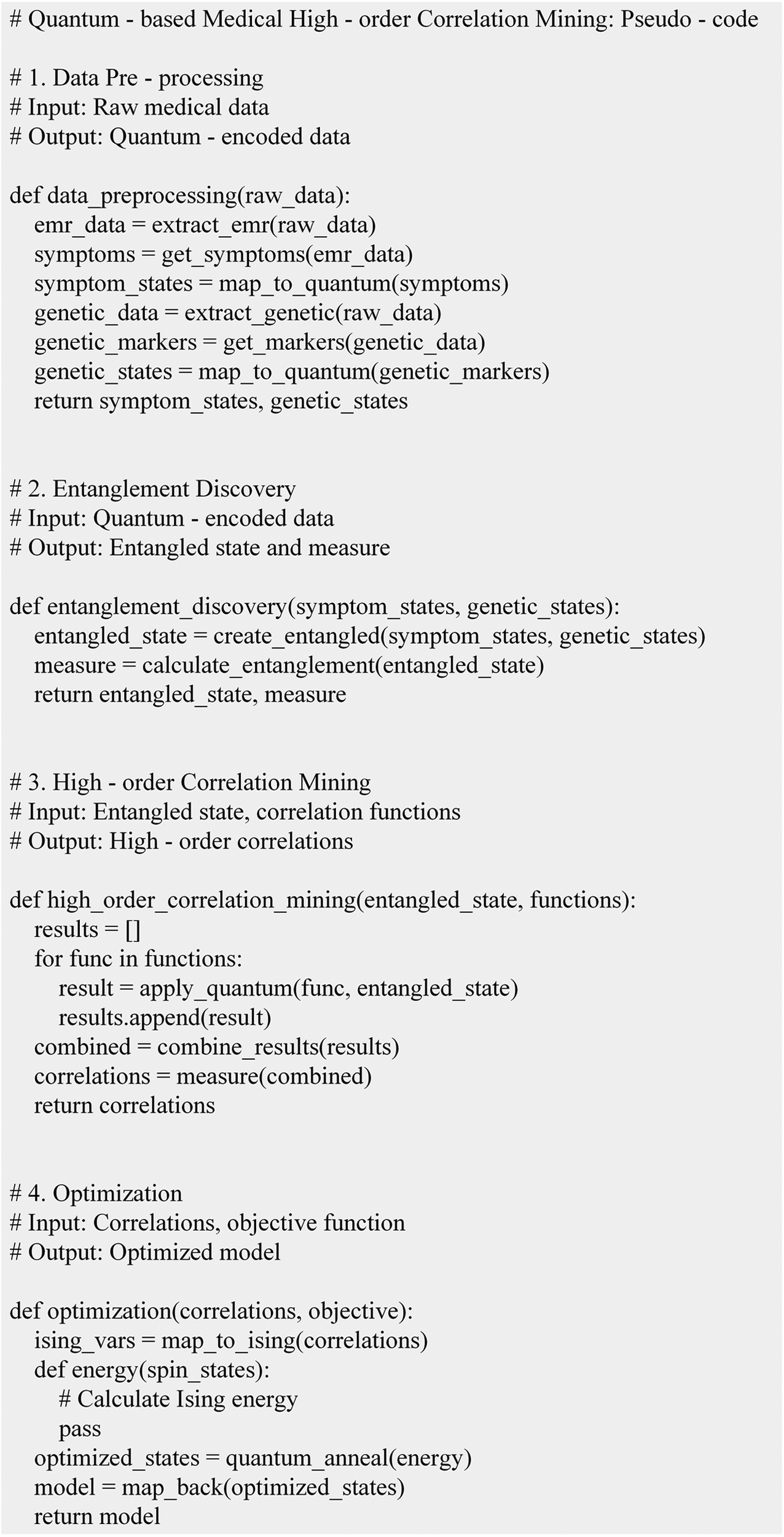 Data mining and analysis are crucial for disease diagnosis, treatment, and health management in smart healthcare. As quantum computing technology has emerged in recent years, more studies have explored its potential applications in medical data processing. Early research, such as that by Coccia et al., highlights that the unique physical properties of quantum computing, such as quantum superposition and entanglement, offer new insights for processing complex medical data. Traditional computing often faces limitations in computational efficiency and the depth of data relationship exploration when dealing with large-scale medical data (6). Quantum computing, with its qubits capable of simultaneously representing multiple states compared to classical bits, theoretically allows for processing various data combinations in a single operation, thereby enhancing data processing speed. Aithal focused on the preliminary applications of quantum computing in medical image analysis. Although it differed from the high-order correlation mining explored in this study, his research demonstrated the feasibility of quantum computing in handling complex types of medical data. In medical imaging, quantum computing optimizes the image feature extraction process through specialized quantum algorithms, providing more accurate image information for subsequent disease diagnosis. This indicated that quantum computing held potential application value across various aspects of medical data processing. Traditional data mining methods have been widely applied in the medical field (7). Radha and Gopalakrishnan elaborated on applying traditional machine learning algorithms, such as decision trees and support vector machines, in disease diagnosis. These algorithms constructed classification models to predict diseases by learning from known case data. However, as the scale of medical data continued to expand and the complexity of data increased, traditional methods faced significant challenges. For instance, when processing large-scale electronic health record data, the computational time for feature selection and model training in traditional algorithms increased significantly (8). As Coccia explored, traditional algorithms often struggled to capture complex interactions among multiple variables when mining high-order correlations, which limited the understanding of deep-rooted disease causes and the formulation of personalized medical plans. In handling large-scale data, quantum computing has already shown tremendous advantages (9). Abbas demonstrated through theoretical analysis that quantum algorithms exhibited a significantly slower growth rate in computational complexity when handling data optimization problems with numerous variables and constraints compared to traditional algorithms. This characteristic made quantum computing more efficient in processing large-scale health data (10). Giani and Eldredge used quantum annealing algorithms to process large-scale bioinformatics data in practical applications. They found that quantum computing could quickly identify optimal or near-optimal solutions, providing empirical solid support for its application in medical data processing. Numerous studies have also achieved results regarding quantum computing's ability to mine data correlations (11). Thomasian and Adashi proposed leveraging quantum entanglement properties to extract correlations within financial data, offering insights applicable to extracting correlations in medical data. In the medical field, mining correlations between data was crucial for disease diagnosis and treatment; for instance, complex higher-order correlations might exist between genes and diseases, as well as symptoms and diseases (12). Saini et al. attempted to construct data association models using quantum circuits to mine simple correlations in medical data, laying a foundation for future research despite not addressing higher-order correlation mining (13). In summary, prior research has established a theoretical and practical foundation for applying quantum computing in healthcare. This study builds upon that foundation to innovate and expand the development of a more comprehensive quantum computing-based smart healthcare framework, paving new avenues for its advancement.