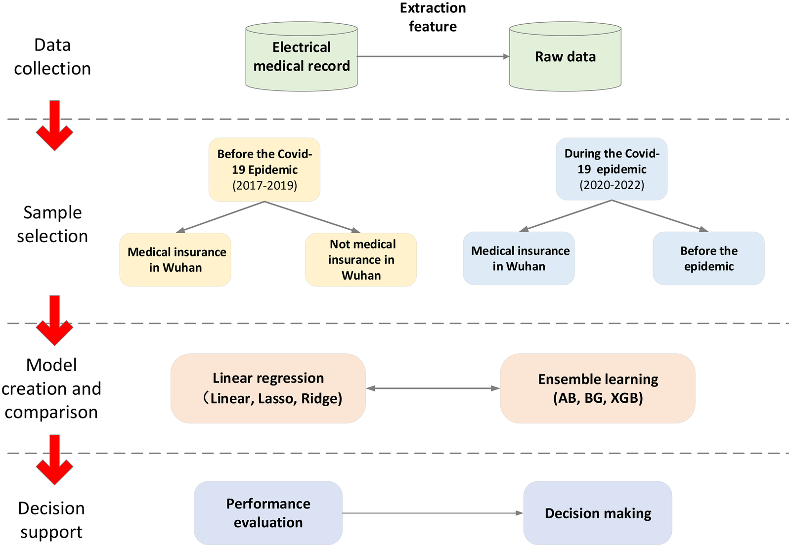 Our study was conducted after collecting electronic medical record data from Zhongnan Hospital of Wuhan University, which is the largest regional teaching hospital in Wuhan. Since the beginning of the pandemic, this hospital has been the leading center for receiving and treating COVID-19 patients from Wuhan. The data were collected from electronic medical queries to identify patient records. With China's full reopening in December 2022, the data were collected from January 2017 to December 2022, mainly reflecting before and during the COVID-19 pandemic. Data have been collected using a structured form. It contains clinical and demographic data for 158,854 patients from 2017 to 2019 and 217,970 patients who visited the hospital before COVID-19. We divided the data into Wuhan and non-Wuhan medical insurance because the reimbursement rate varies from place to place, and patients can only be reimbursed in their domicile.