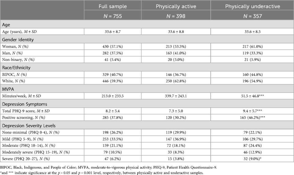 There was a statistically significant difference in MVPA between men and women at baseline [H(2) = 9.1, p = 0.01] and post-hoc comparisons using Nemenyi's test of multiple comparisons revealed that men engaged in an average of 49 more minutes of MVPA per week than women. We also observed a significant gender difference in depression symptoms [H(2) = 17.0, p < .001]. post-hoc comparisons revealed a statistically—but not clinically—significant difference, with both women and adults identifying as gender non-binary reporting higher PHQ-9 scores than men (1.62 points and 2.68 points higher, respectively). Finally, there was a significant, negative correlation between age and depression symptoms (r = −.16. p < .001). There were no significant differences in PHQ-9 score across races and ethnicities (p = 0.85). There were no significant differences in MVPA based on other gender identities or races and ethnicities (ps > 0.07), and no significant correlation between MVPA and age (p = 0.43). While physical activity engagement and depression symptoms differed significantly between the active and underactive groups (see Table 1), the standard deviation within each group indicated substantial heterogeneity.
