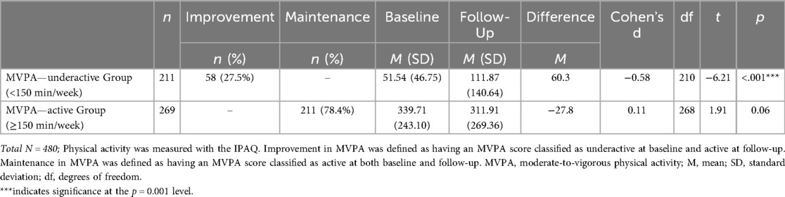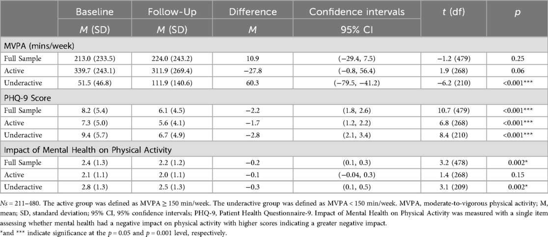 Table 2. Paired t-test results: changes in physical activity engagement, depression symptoms, and impact of mental health on physical activity stratified by baseline physical activity status.