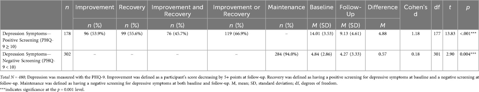 Table 3 details change in depression among participants with different levels of baseline depression. Participants with a positive depression screening at baseline (n = 178) reported an average decrease of 4.88 points on the PHQ-9, representing a statistically significant 35% reduction in depressive symptoms (p < .001). In addition, 66.9% of the sample reported improvement or recovery in depressive symptoms. Participants with a negative depression screening at baseline (n = 302) reported an average decrease of 0.57 points on the PHQ-9, representing a statistically significant 12% reduction in depressive symptoms (p = 0.004). Among this sub-sample, 94% maintained their negative screening for depression at follow-up.