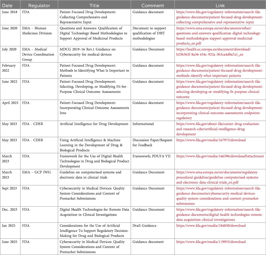 Table 1 shows the timeline for advances in the regulatory landscape over the past several years both in U.S. and Europe, with key regulatory publications from the U.S. Food and Drug Administration (FDA) and European Medicines Agency (EMA) highlighted. Although primarily focused on regulation of medicinal products, we include cybersecurity guidance documents focused on medical devices generally relevant to all DHTs, whether medical devices or not. Notably, the FDA's March 2024 “AI & Medical Products” guidance specifically describes how medicines and device regulators are working together in this rapidly evolving area.