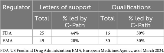 C-Path is a not-for-profit organization that has nearly two decades of experience leading public-private partnerships spanning multiple diseases to advance regulatory maturity of drug development tools (Table 2) across several neurological disorders including Alzheimer's disease (AD), PD, and DMD. C-Path-led consortia have achieved regulatory milestones from full qualification opinions to Letters of Support and Fit for Purpose FDA and EMA endorsements (43).