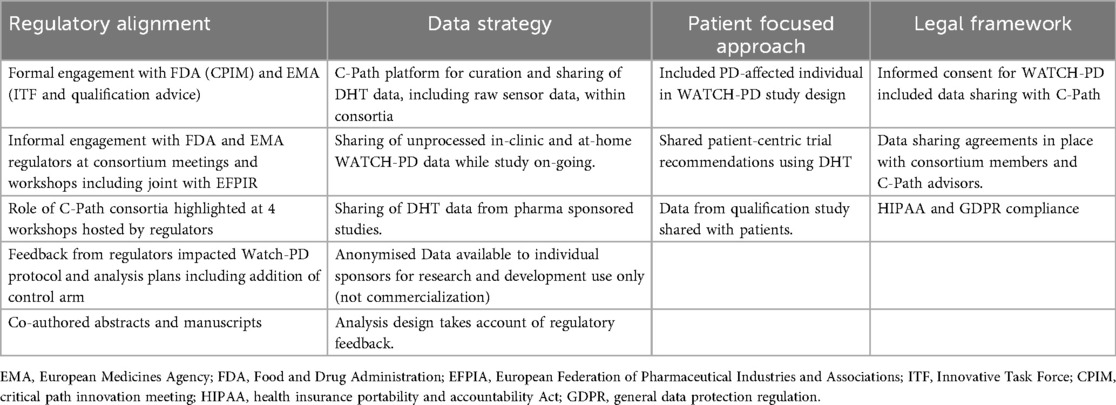 There is an evolving regulatory landscape for Digital Health Technologies as drug development tools, with multiple stakeholders independently approaching regulatory agencies for endorsement. Experience of many parallel initiatives approaching regulatory agencies to date suggests that navigating the regulatory path to enable DHTs to have a significant impact on drug development and defining success in addressing drug development needs remain challenging. The experiences of the 3DT consortium highlight the value of collaborative approaches involving pharma industry and academic experts, leveraging Critical Path Institute's experience of advancing the regulatory maturity of a diverse range of drug development tools, from Patient Reported Outcomes (PROs) to imaging biomarkers (46). Tackling challenges collectively by advancing data-driven solutions and sharing costs and risks, as well as embracing open science, can avoid duplication of effort and therefore improve the efficiency with which we advance the regulatory acceptance of DHTs and their use in clinical trials. While DHTs make use of different technologies from those used in other DDTs, C-Path's experience in other types of DDTs, and its existing infrastructure for legal, data, and regulatory engagement has proved valuable in enabling the 3DT consortium to progress. Specific regulatory feedback on the Watch-PD case study itself (such as the need to incorporate a control group, and to add a qualitative element to the study to assess the symptoms of most importance to patients) has informed multiple sponsors as to which considerations are essential across device platforms, both in other PD applications and in different disease areas.
