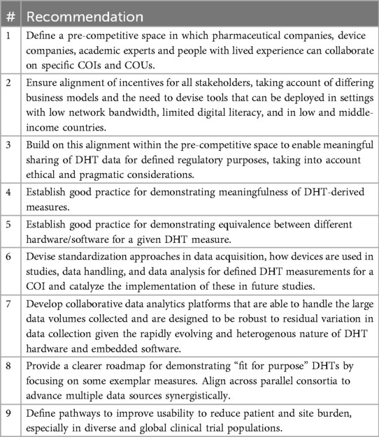 For much work to date on DHT- measures as DDTs, it is hard to precisely define all these elements. A diversity of stakeholders is key to success and spans technology experts, clinicians, industry, academic experts, nonprofit organizations, people with lived experience, and regulators themselves. New approaches and new models of collaboration are needed to advance the field as efficiently as possible to be able to attend to the time-sensitive needs of patients. Such collaborative approaches should learn lessons from other types of DDTs (e.g., imaging) to address challenges of standardization and collaborative implementation of analysis methods to enable convergence rather than divergence of proposed DHT measurements. Given the challenges of integrating and harmonizing legacy data collected across distinct device platforms, it is recommended that precompetitive collaborations focus on sharing risks, costs, and prospective study design and collection to optimize DHT studies for the future. We propose nine crucial next steps to advance the field, as shown in Table 4. While these recommendations are based on experience with this Parkison's disease case study, they are more generally applicable for DHTs used as DDTs in this regulatory environment.