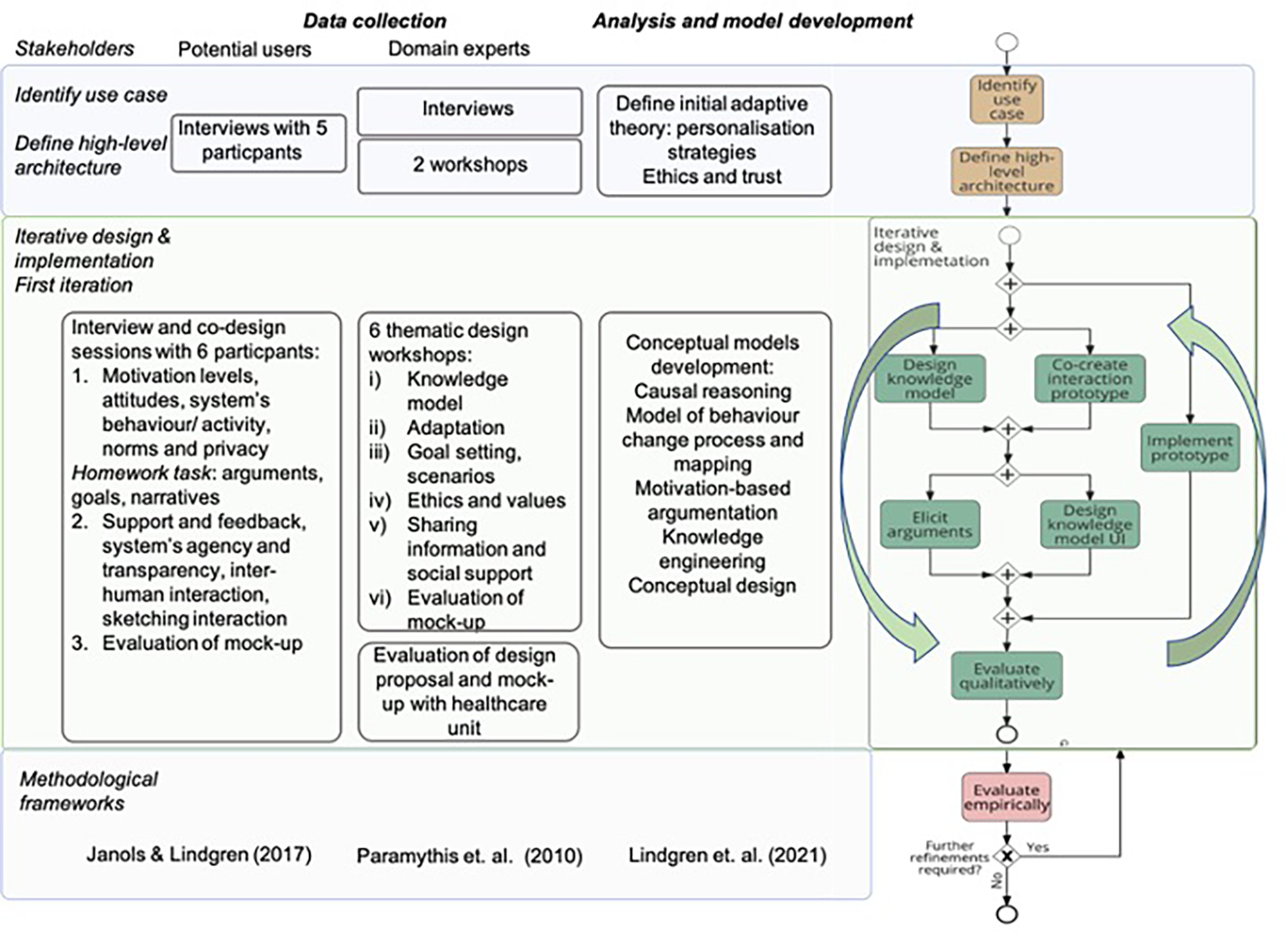 The content of the sessions with the domain experts followed the framework for layered interactive, adaptive systems specified in (19), with an activity-centered focus to frame the health-promoting activities in which the application could play a role (11). The co-design methodology guiding the sessions with end users was based on (17).