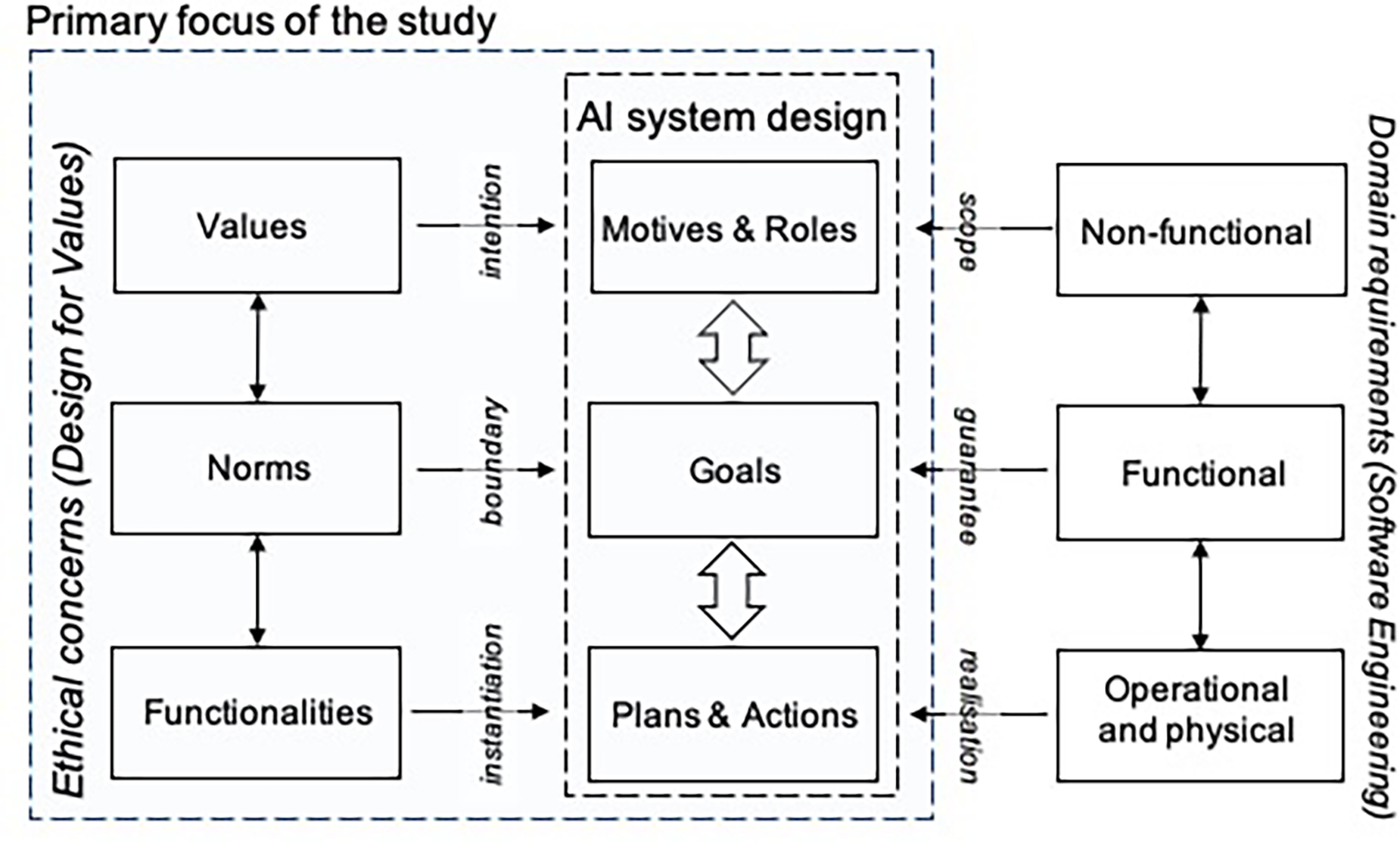 The results are organized based on the model for responsible design of AI systems (1) (Figure 2), with a focus on ethical concerns and AI system design. In the following section, the results regarding the system’s motives and roles related to values are presented. The system’s goals related to social norms are presented in Section 3.2, and the results regarding the system’s plans and actions related to functionalities are presented in Section 3.4.
