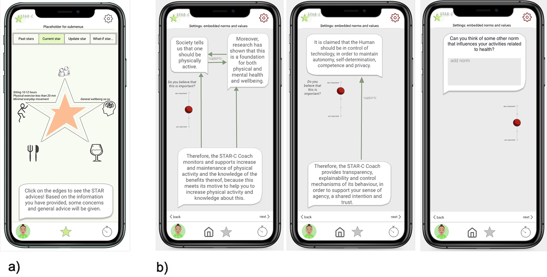 The values and norms that were discussed among participants in the design process were analyzed and connected to the system’s goals, plans, and activities to be conducted together with those of the user, such as setting goals, as were the requirements that emerged through the process.
