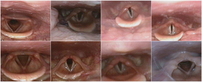 Examples of pre-processed laryngeal images from different patients. The top row shows an increasing level of narrowing at the glottic level, from left to right. The bottom row shows an increasing level of narrowing at the supraglottic level, from left to right.