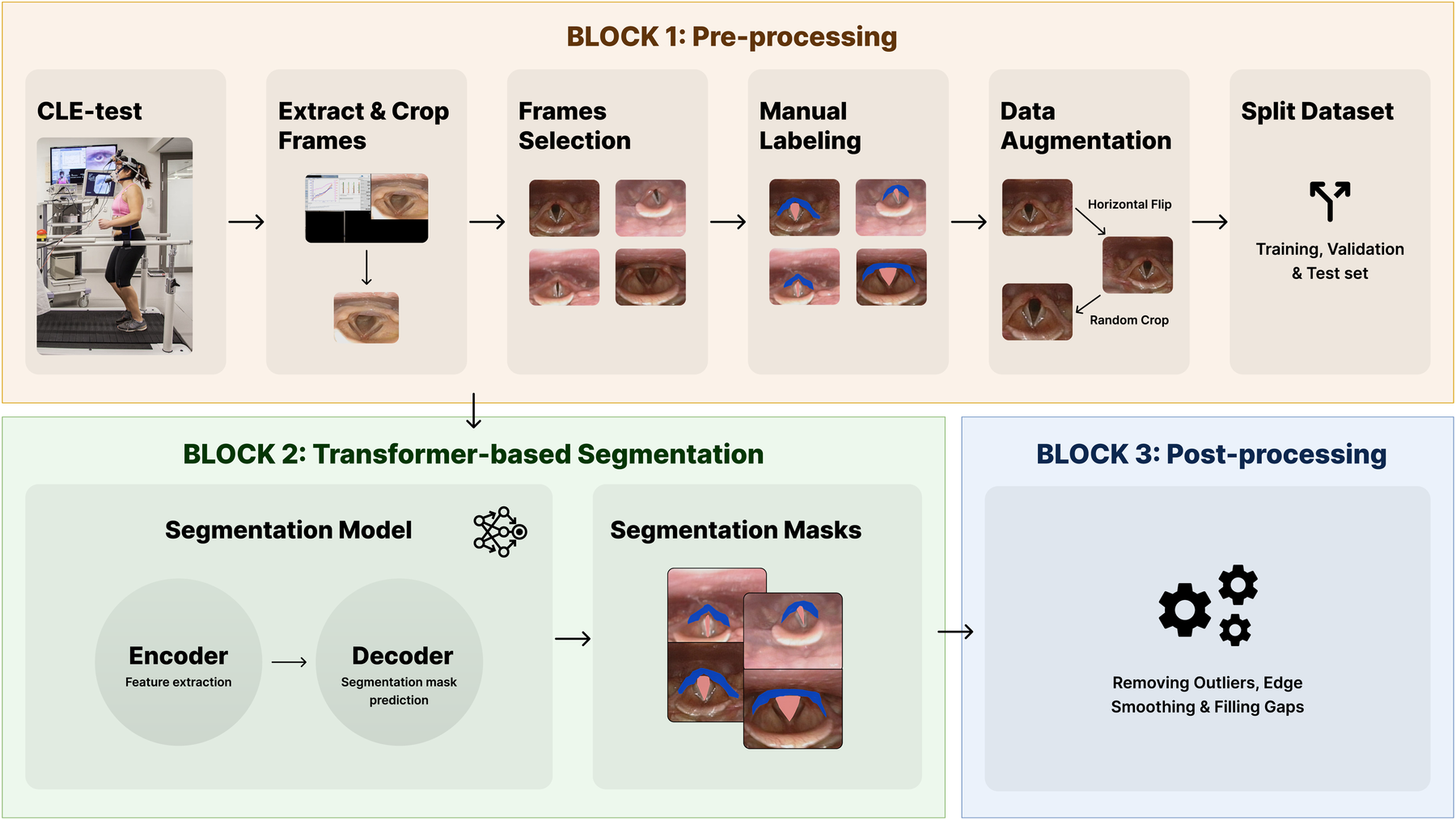 The blocks of the LarynxFormer framework. Block 1 shows the pre-processing steps. Block 2 is the segmentation part of the framework. Block 3 describes the post-processing steps. (Block 1, CLE-test image is reproduced with permission of the © ERS 2024: Eur Respir J 50(3) 1602221; DOI: 10.1183/13993003.02221-2016 Published 9 September 2017).