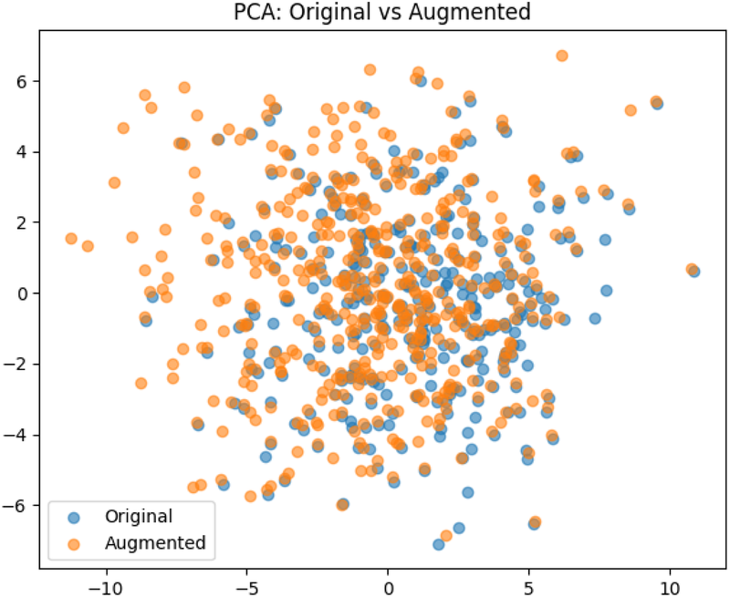 The pre-processing step resulted in a dataset of 340 images. Data augmentation: To avoid overfitting of the models, and to enable better generalization, data augmentation techniques were applied. Utilizing the transformation package from PyTorch (22), we augmented the images by introducing random resizing crops and horizontal flips. These augmentation steps effectively doubled the size of our dataset. Embeddings were obtained from images to examine the feature-space relationship between original and augmented samples. Dimensionality reduction methods like PCA and t-SNE were applied to facilitate a clear comparison, independent of task-specific model inference. The visualizations (Figures 3, 4) reveal strong overlap between original and augmented data distributions, suggesting that augmentations have minimal impact on feature-level representations.