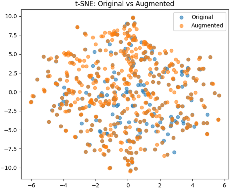 The result of the t-Distributed Stochastic Neighbor Embedding on the original and augemented data used for training.