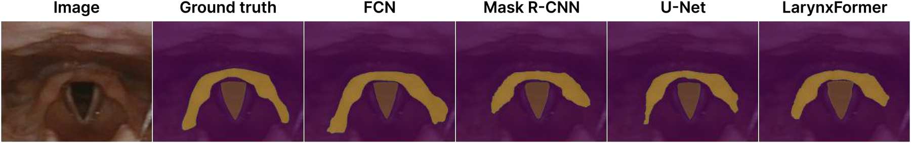 All models trained in this study, including the best-performing LarynxFormer, are not ready for use in a clinical setting. Many prediction mistakes are still made, and a bigger dataset and more computational power are needed to train more robust models. Moreover, the segmentation masks can be further analyzed to provide more useful insights in addition to the position of the vocal folds and supraglottis. This research primarily focuses on comparing the models to identify the most suitable solution for using ML to segment the laryngeal structures.