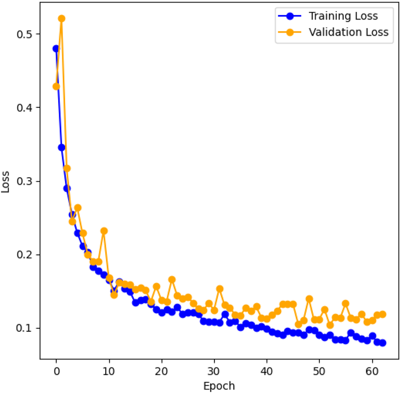 Figure 8 shows the training and validation cross-entropy loss for the LarynxFormer training procedure. The training lasted for 2 h across 63 epochs. Early stopping was implemented to prevent overfitting, allowing a maximum of 10 epochs without increasing validation loss. After testing, 10 epochs for early stopping turned out to be appropriate. Using less than 10 epochs resulted in the model stopping too early, with a small relative decrease in loss. Values higher than 10 led to overfitting of the model. Consequently, the final model version was selected after 53 epochs of training. The hyperparameters for each of the models can be found in Table 2.