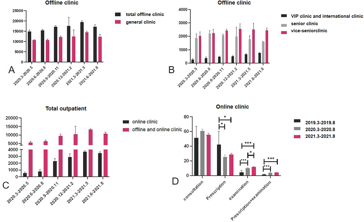 In this study, the total number of patients in offline clinics, i.e., a VIP and international clinic, a senior clinic, a vice-senior clinic, and a general clinic, and in an online clinic, in different stages, periods, and groups were counted separately, and the mean, standard deviation, and trend of change in the number of patients in different types of clinics per month were calculated.