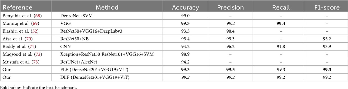 The accuracy, precision, recall, and F1-score on the PH2 dataset are presented in Table 2 and Supplementary Figure S1. Compared with the CNN-based method for feature extraction and then feeding these features into the ML-based classifier (68, 70, 72), the custom CNN-based model (71), and CNN-based End-to-End models (68, 69), our proposed feature-level fusion (FLF) and decision-level fusion (DLF) ensemble framework achieved an accuracy of 99.3%, and 99.2% respectively for the FLF and DLF. Moreover, we observe that the proposed FLF approach achieves performance comparable to the best existing method reported by Maniraj et al. (69), while also providing consistently high precision, recall, and F1-scores.