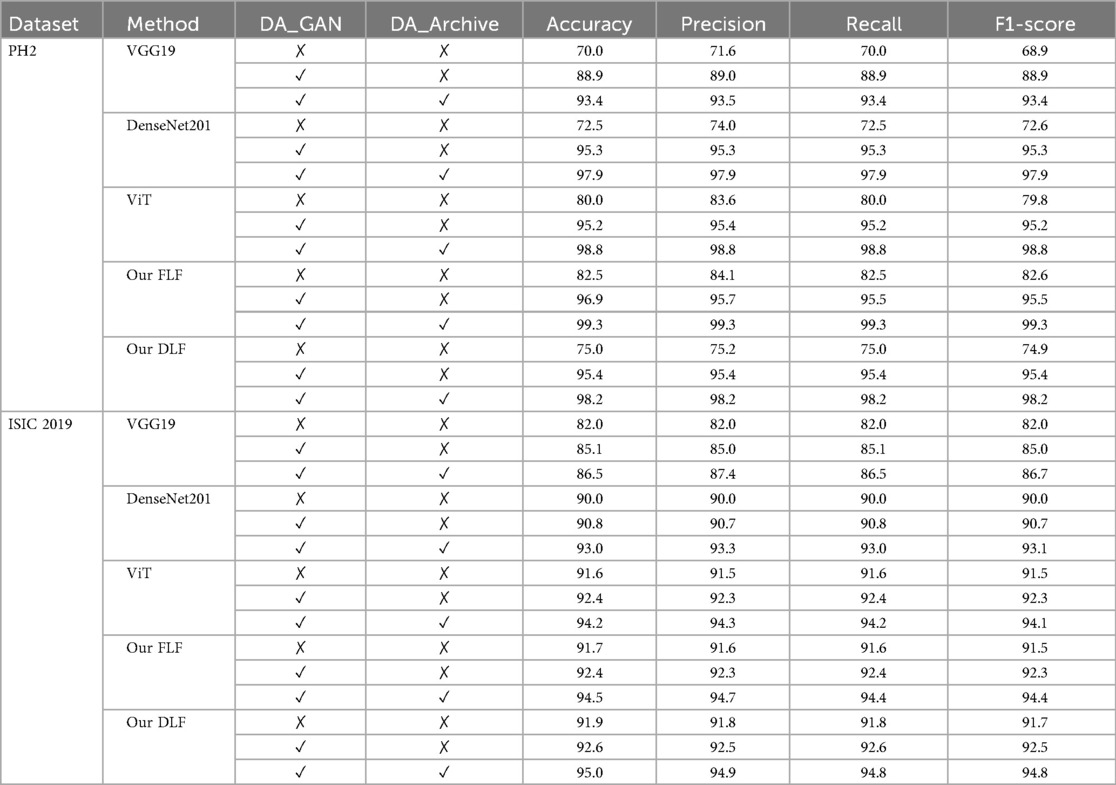 Our proposed framework leverages an ensemble approach that integrates two convolutional neural networks (CNN)-based architectures: a modified DenseNet201 and a VGG19. Additionally, it incorporates an attention-based vision transformer model, ViT. To address data scarcity, we employed a pre-training strategy utilizing a generative adversarial network (GAN) (65) for generating image samples artificially. We also added samples from other ISIC archives. Moreover, we added other online data augmentation techniques during training. Here, we conduct a comparative analysis of the performance achieved by our proposed framework against various baselines (i.e., base models w/o Data Augmentation (DA), DA with GAN (DA_GAN), and ISIC archives (DA_Archive)). Additionally, we also compared each of the base models. Similarly, we further delve into an in-depth performance analysis of the FLF and DLF for the final classification. In this section, for ablation studies of our proposed framework, we selected the small-scale and large-scale datasets PH2 and ISIC 2019 and adhered to the identical protocol outlined in Section 4.1 for these analyses.