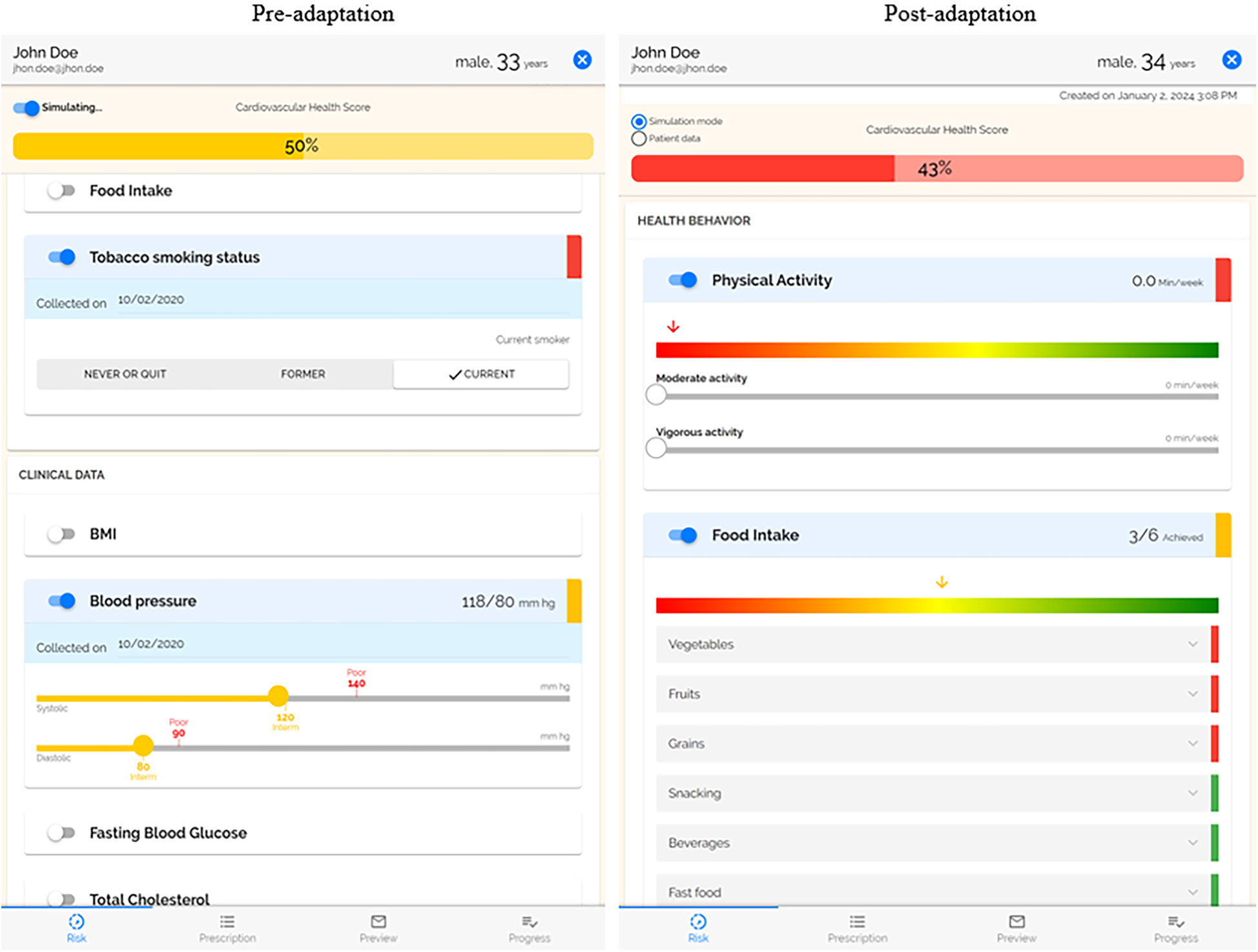 Side by side of risk profile. The post-adaptation risk profile uses the AHA's Life's Essential 8, which added sleep and updated the scoring. Physical activity and food intake were moved to the top as the focus of the PREVENT intervention.