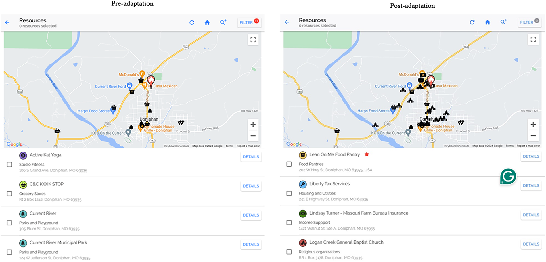 Side by side of research map. The post-adaptation resource map was expanded to resources that support social needs more broadly. The post adaptation includes functionality for care team members to add/edit resources, making them verified resources, * = the resource is active and has been verified by team member.