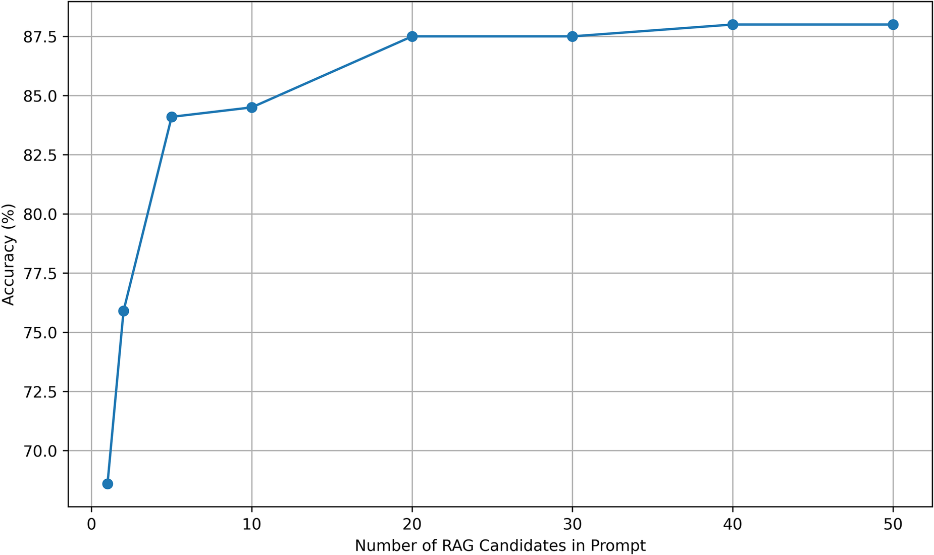 The performance of large language models for term normalization was enhanced by augmenting the prompt with up to 50 candidate terms. The top 20 candidates from the BioBERT embeddings were used in the final analysis.